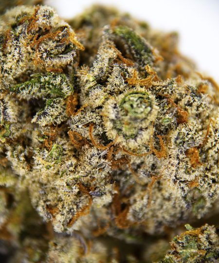Blue Chem Snow AAA is a slightly sativa-dominant hybrid strain (60% sativa/40% indica) created through crossing the infamous Chemdawg X Sour Diesel X Blueberry X Oregon Snow strains. This insanely potent four-way cross is not for the faint of heart – with its super high 23-29% average THC level, Blue Chem Snow AAA has been known to knock out even the most experienced patients. This baby packs a super lifted onset that smashes into the mind, leaving you feeling insanely euphoric and pretty out of focus. A creeping body high comes next, sneaking into your limbs and locking you to the couch while your mind soars higher and higher through stoney bliss. These heavy effects, in combination with its super high THC level, make Blue Chem Snow AAA the perfect choice for the experienced patient suffering from conditions such as appetite loss, depression, chronic fatigue, nausea, and chronic stress. It has a mouthwateringly sweet and sour chemical blueberry citrus flavor that can easily lead you to overindulge. The aroma is very similar, although it does pack a light earthy pungency to it and a hint of spicy diesel. Blue Chem Snow AAA buds have small, tight pepper-shaped forest green nugs with vivid orange hairs and a coating of sticky dark amber crystal trichomes.