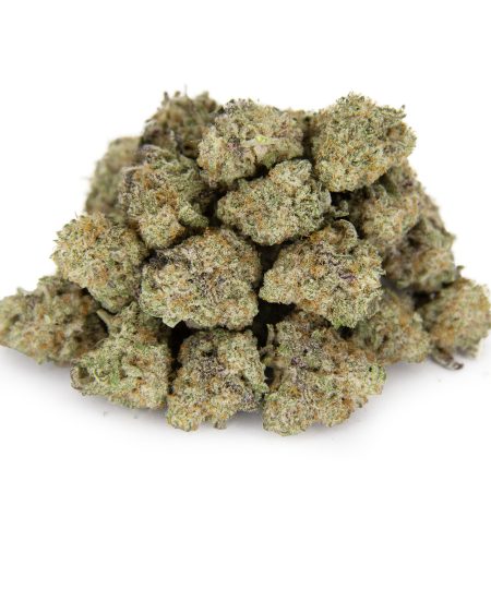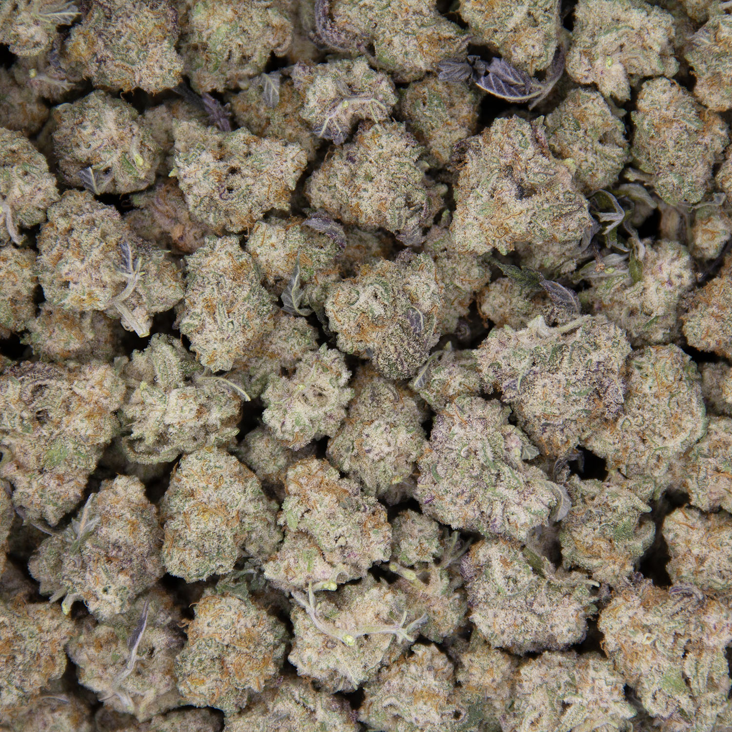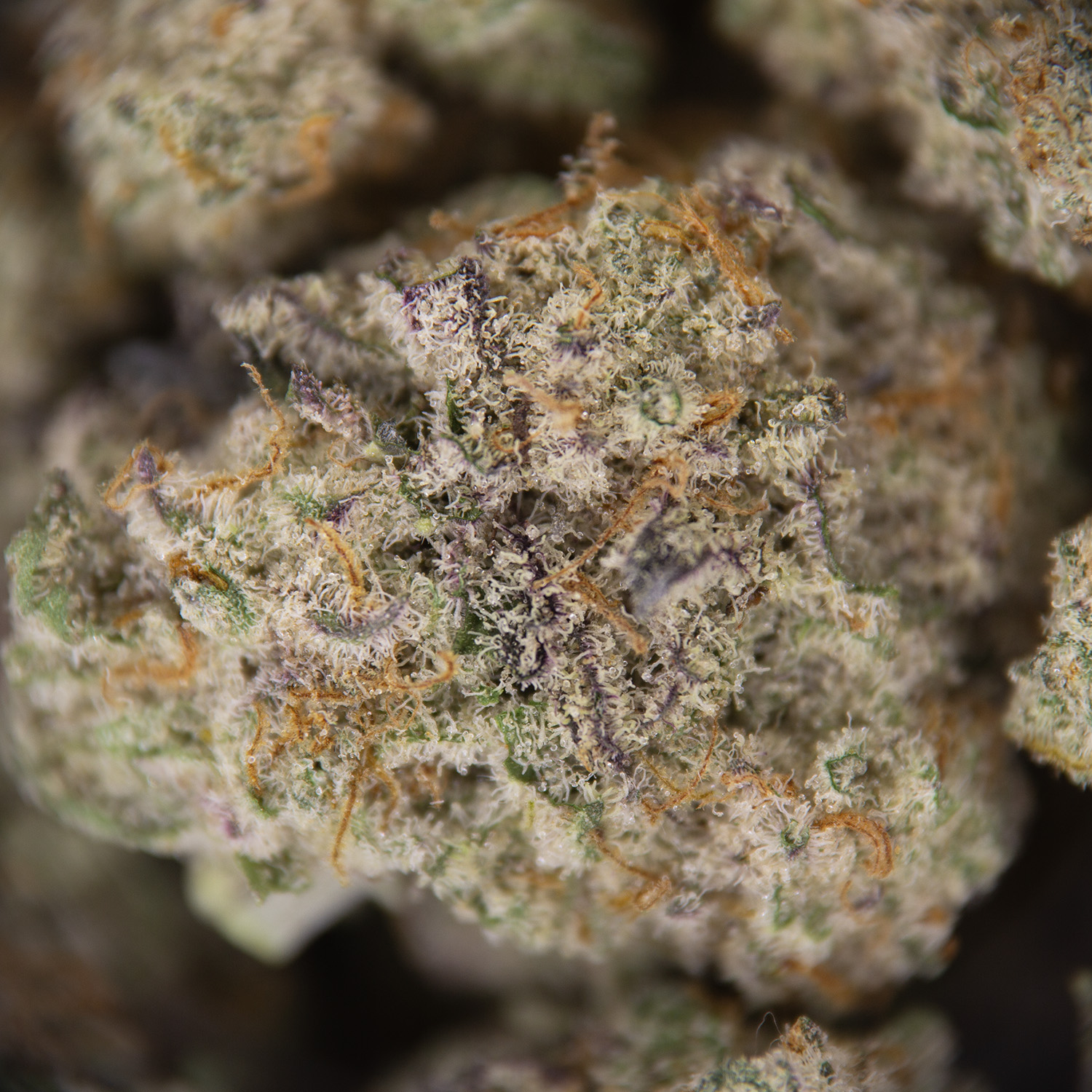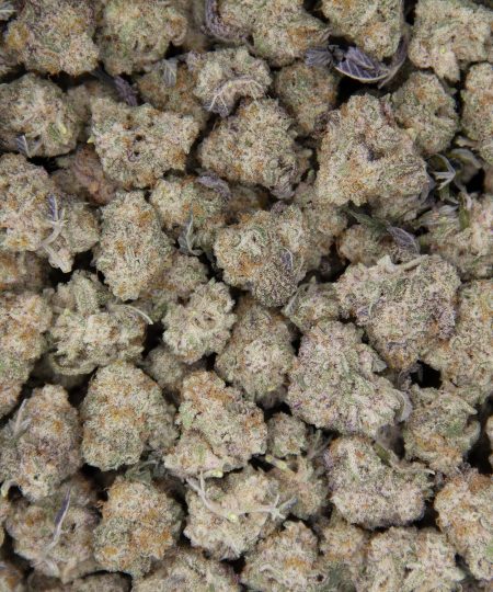 There is some dispute over the true parents of this indica-dominant award winner: Some sources claim they’re F1Durb (an indica-dominant descendant of Durban Poison) and Florida OG (a little known indica). Others say they’re Blueberry and Girl Scout Cookies. Whatever its origins, Blue Cookies has a sativa/indica ratio of between 10:90 and 30:70. That makes for a potent body buzz, although the sativa genes also provide an energized cerebral effect. Use this strain to treat anxiety, low mood, headaches, irritability, and persistent physical pain. CBD, on the other hand, makes up less than 2% of this plant’s cannabinoid content, so Blue Cookies shouldn’t be used as an exclusive treatment for seizures or other health problems that respond to CBD. As the name suggests, this strain’s dense nugs have a dark bluish tint, as well as a thick layer of resinous crystals on the surface. The flavor is sweet and smooth, with notes of orange, earth, and candy. The smell is sweet and reminiscent of cookies.