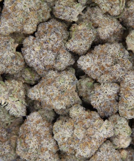 Royal Jelly is a slightly indica dominant hybrid strain (60% indica/40% sativa) created through crossing the tasty Jealousy X Kush Mints strains. Named for its mouthwatering flavor and high-class effects, you’ll want to dip into the Royal Jelly again and again. Like its name implies, Royal Jelly has a sweet and fruity jelly flavor accented by sour citrus and a touch of flowery spices. The aroma is very similar, with a sour citrusy overtone accented by sugary fruity jellies and spicy diesel. The Royal Jelly high is one for the ages, with a happy, lifted overtone that will have you flying high mentally and settling down physically. You’ll feel your mind lifted into a state of happiness that’s slightly weighty and unfocused, free of any bad moods or racing thoughts. A light physical tingle comes next, washing over you and dropping your body into a heavy state of physical relaxation that can be pretty arousing at times. This combination will quickly turn sedative, so mind your dosage if you have things to do other than napping peacefully! With these effects and its super high 28-30% average THC level, Royal Jelly is often said to have an edge in treating conditions such as depression, chronic stress or anxiety, insomnia, chronic fatigue and chronic pain. This bud has dense and fat heart-shaped forest green nugs with deep purple leaves, thin orange hairs and tiny, purple crystal trichomes.